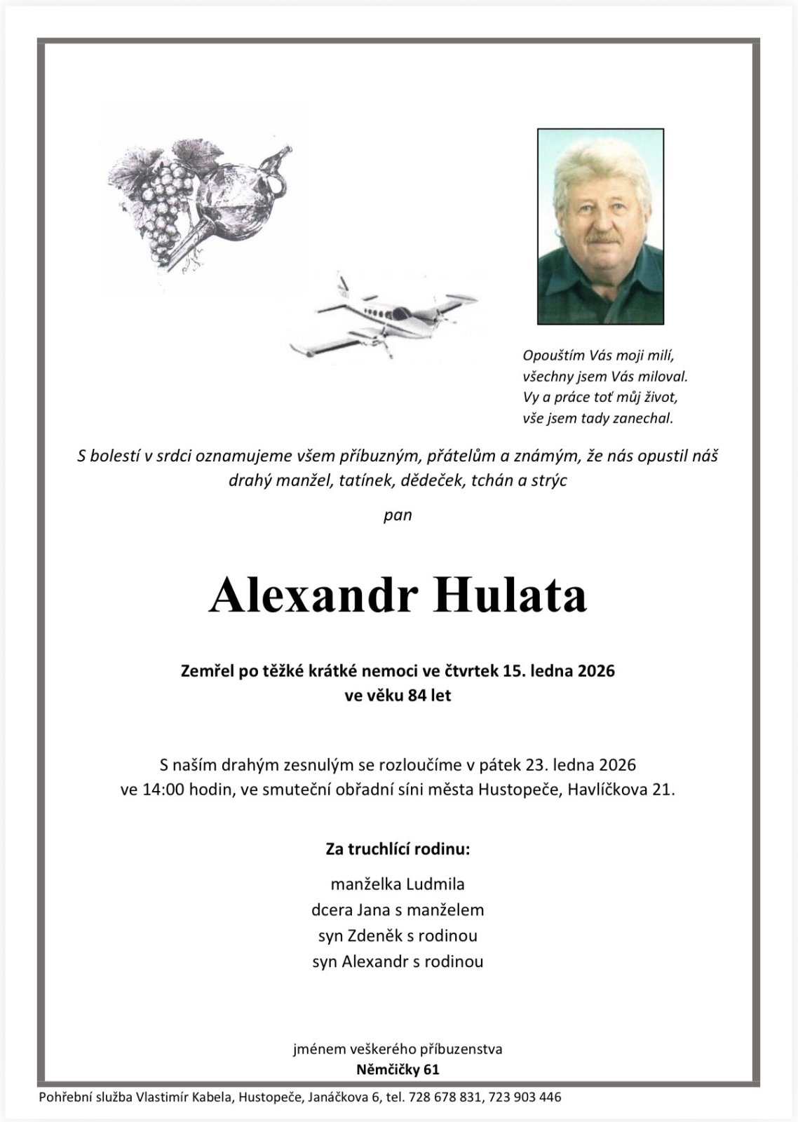 Děkujeme všem, kteří mu věnují vzpomínku u sklenky dobrého vína.